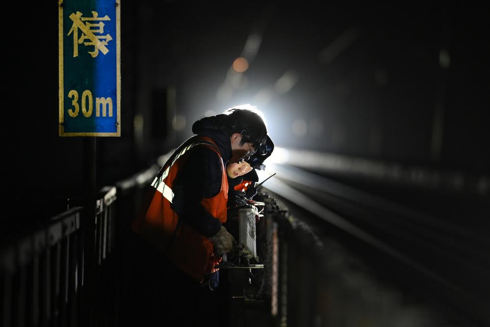 Railway workers inspect the circuit facilities of a railway section in Lyuliang City, north China's Shanxi Province, Jan. 21, 2025. (Photo by Liu Liangliang/Xinhua)