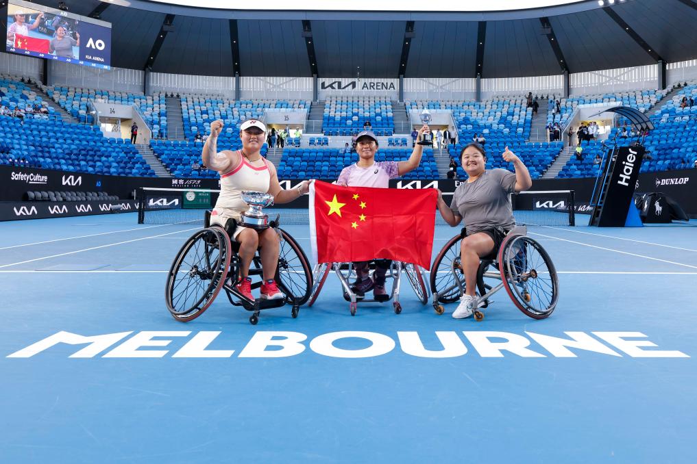 Wang Ziying (R)/Li Xiaohui (L) and Zhu Zhenzhen pose with the trophies and the Chinese national flag after the women's wheelchair doubles final between Wang Ziying/Li Xiaohui of China and Zhu Zhenzhen (China)/Tanaka Manami (Japan) at Australian Open tennis tournament in Melbourne, Australia, Jan. 24, 2025. (Photo by Chu Chen/Xinhua)