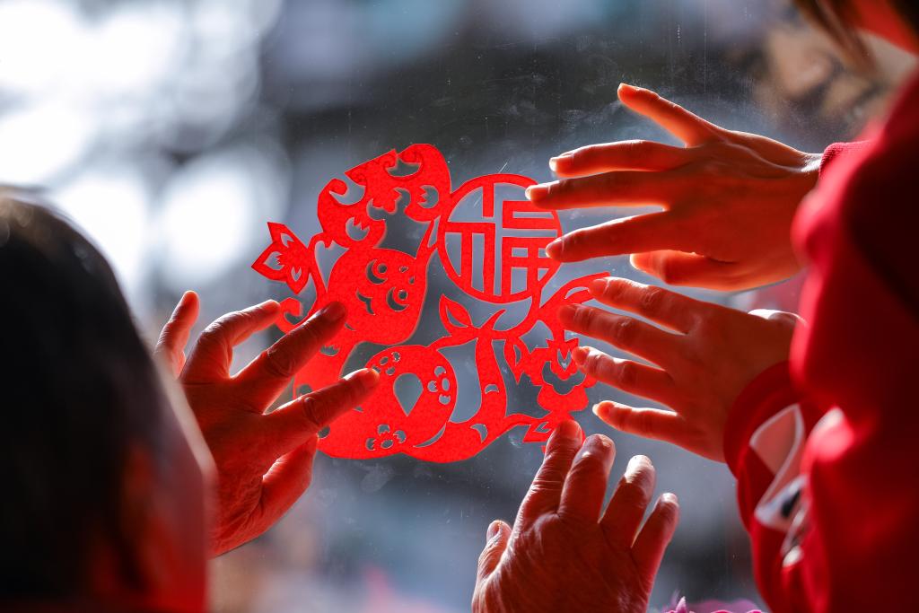 An elder and a staff member of a rest home paste a paper-cutting on a window to greet the upcoming Chinese Lunar New Year in Qingdao, east China's Shandong Province, Jan. 24, 2025. (Photo by Zhang Ying/Xinhua)