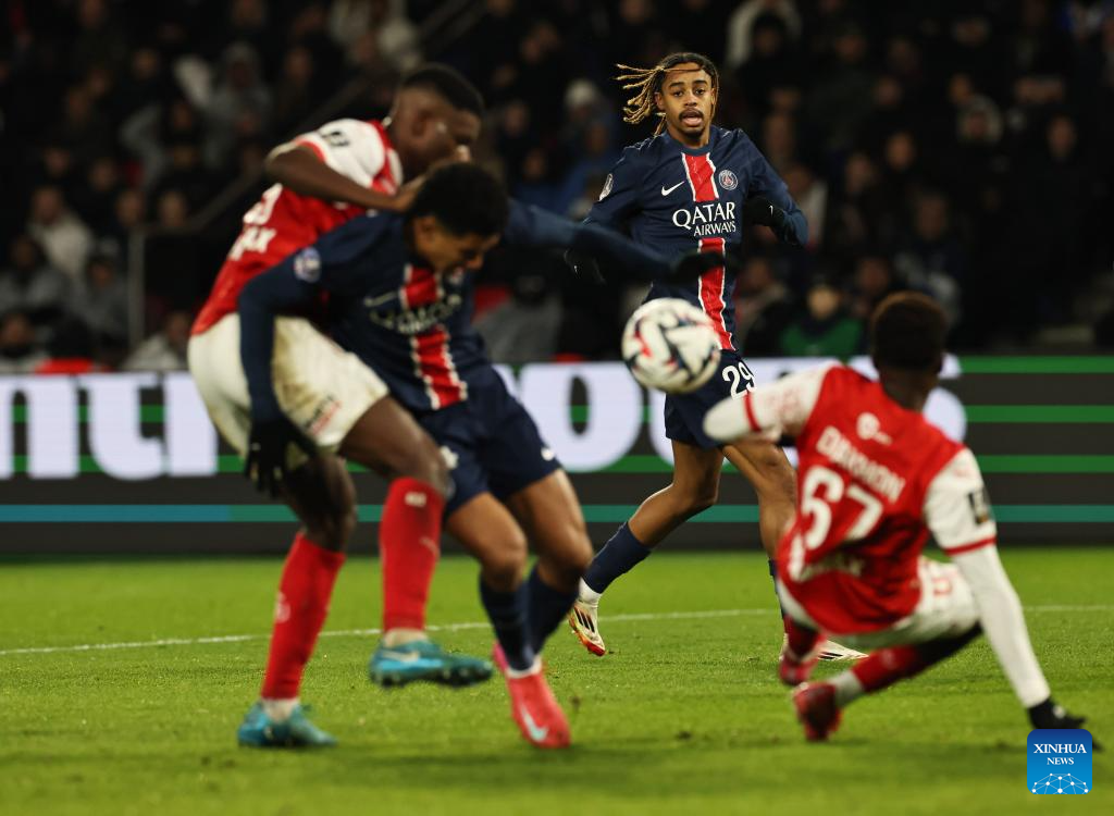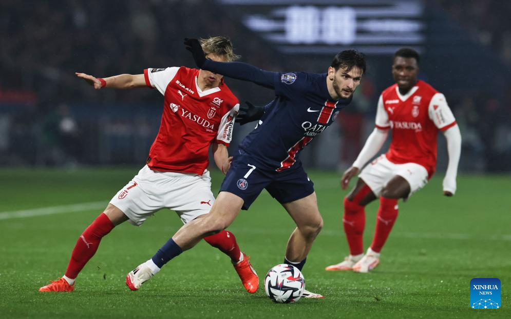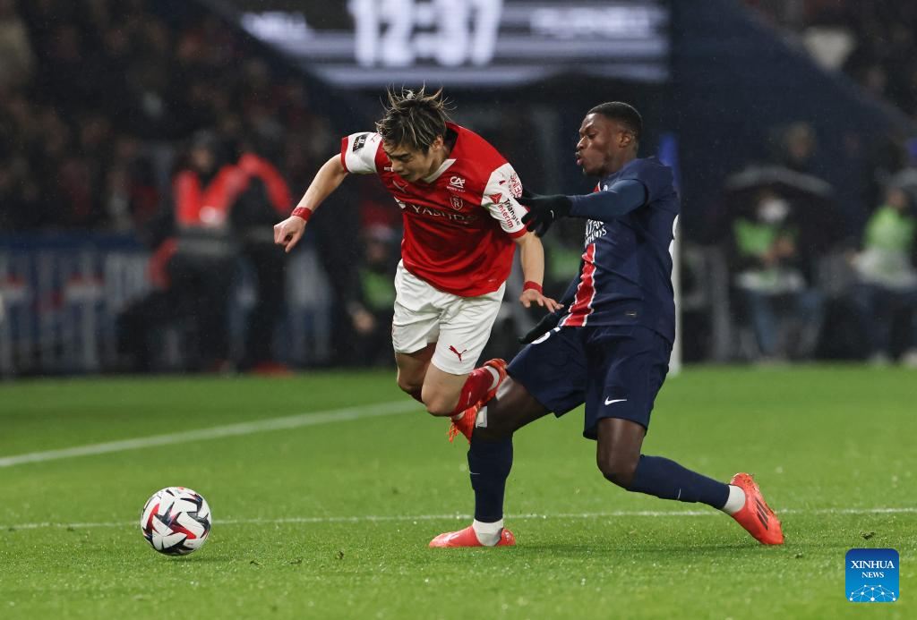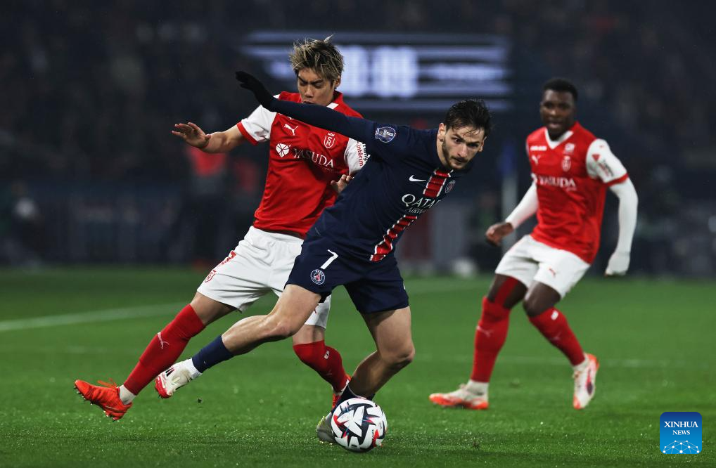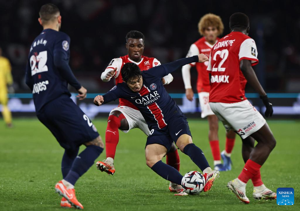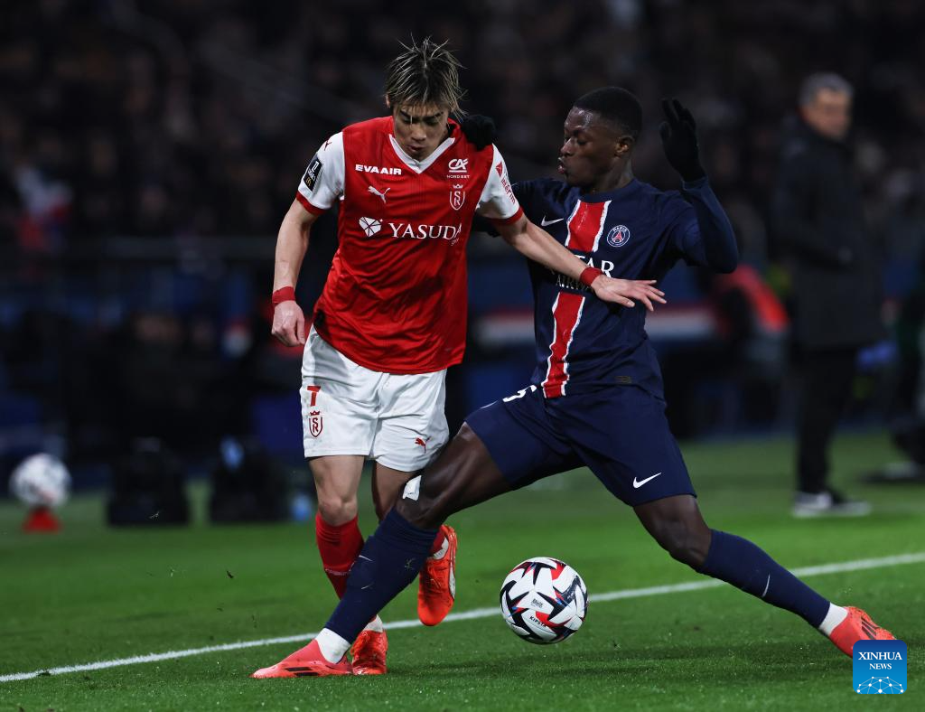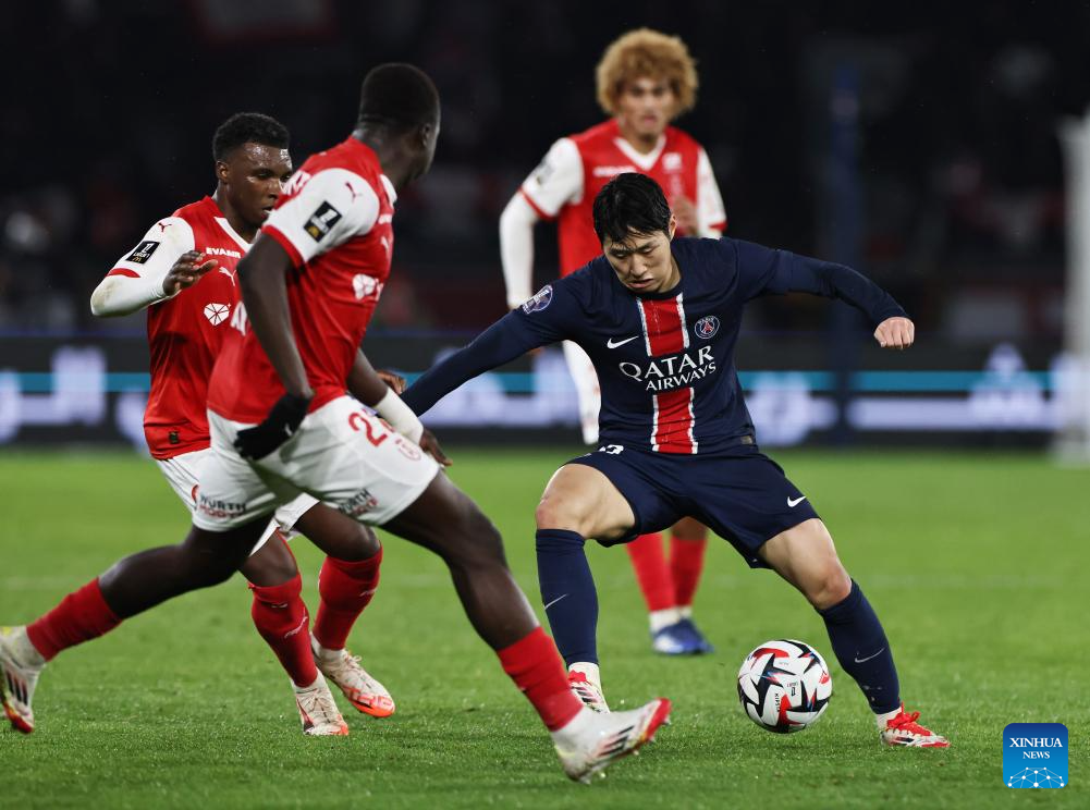 Lee Kangin (Front C) of Paris Saint-Germain competes during a French Ligue 1 football match between Paris Saint-Germain and Stade de Reims in Paris, France, Jan. 25, 2025 (Xinhua/Gao Jing)