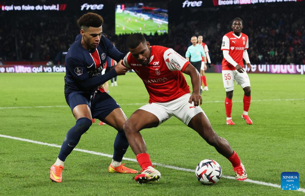 Desire Doue (L) of Paris Saint-Germain vies with Sergio Akieme of Stade de Reims during a French Ligue 1 football match between Paris Saint-Germain and Stade de Reims in Paris, France, Jan. 25, 2025 (Xinhua/Gao Jing)