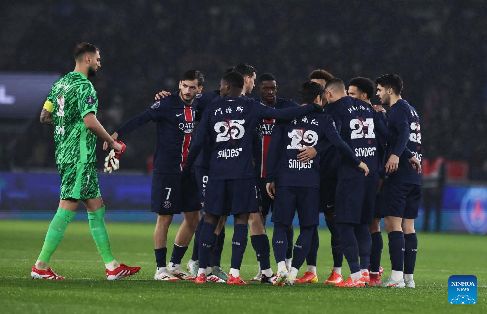 Players of Paris Saint-Germain wear jerseys with their names in Chinese during a French Ligue 1 football match between Paris Saint-Germain and Stade de Reims as part of the Day of China activites to celebrate the Chinese Lunar New Year in Paris, France, Jan. 25, 2025. (Xinhua/Gao Jing)