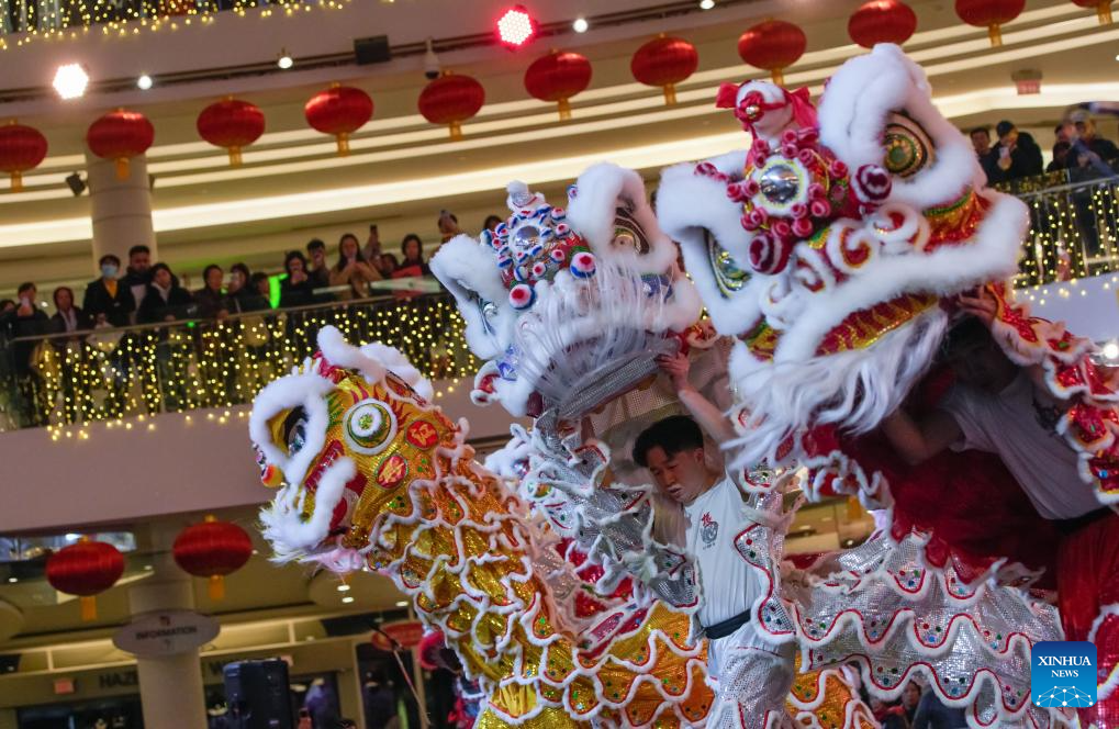 People watch a lion dance performance during the Chinese New Year countdown event for the Year of the Snake at Aberdeen Center in Richmond, British Columbia, Canada, Jan. 28, 2025. Nearly a thousand people participated in the Chinese New Year countdown event at a shopping mall, featuring festive performances to mark the beginning of the Year of the Snake. (Photo by Liang Sen/Xinhua)