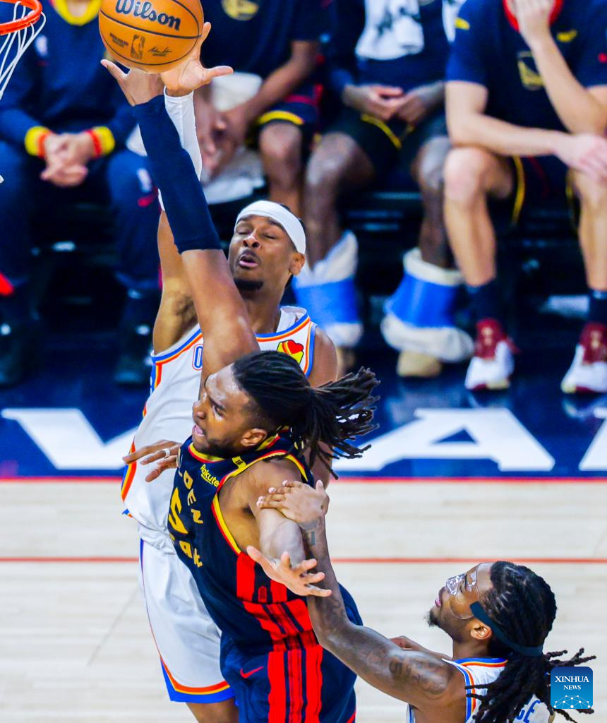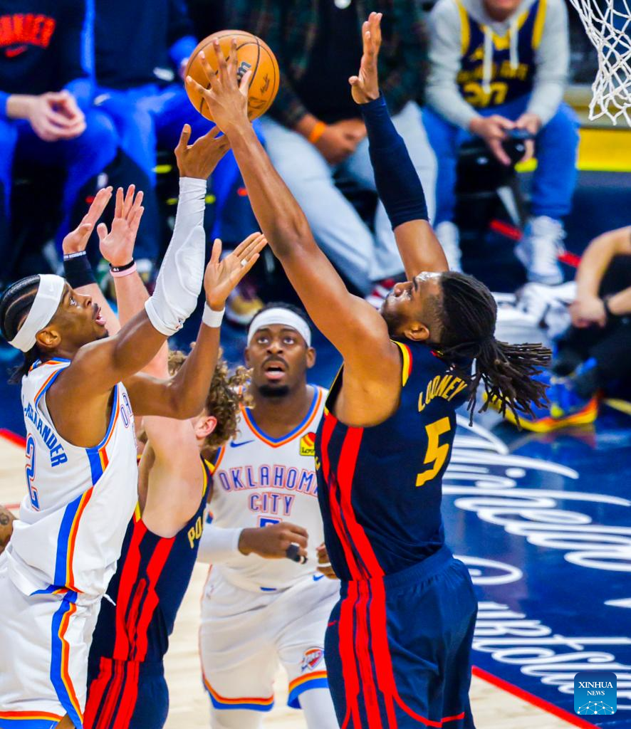 Kevon Looney (C) of Golden State Warriors vies for the ball during the NBA basketball game between Golden State Warriors and Oklahoma City Thunder in San Francisco, the United States, Jan. 29, 2025 (Photo by Arthur Dong/Xinhua)