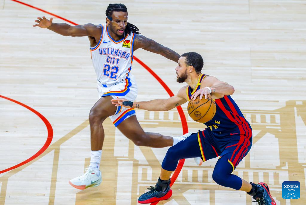 Stephen Curry (R) of Golden State Warriors breaks through during the NBA basketball game between Golden State Warriors and Oklahoma City Thunder in San Francisco, the United States, Jan. 29, 2025 (Photo by Arthur Dong/Xinhua)
