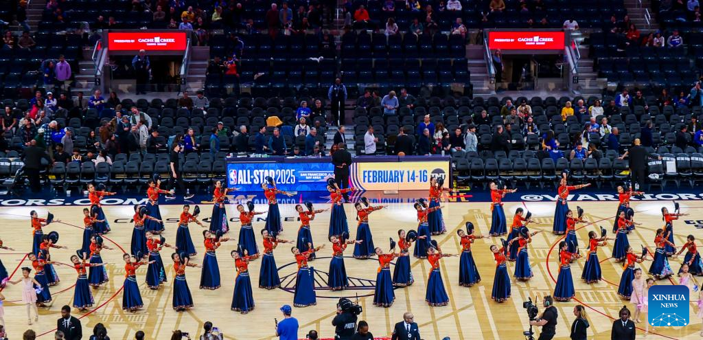 Actors perform to celebrate Chinese New Year during the NBA basketball game between Golden State Warriors and Oklahoma City Thunder in San Francisco, the United States, Jan. 29, 2025 (Photo by Arthur Dong/Xinhua)