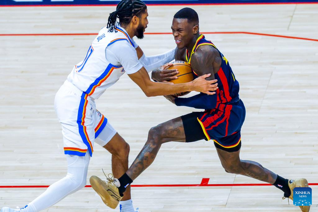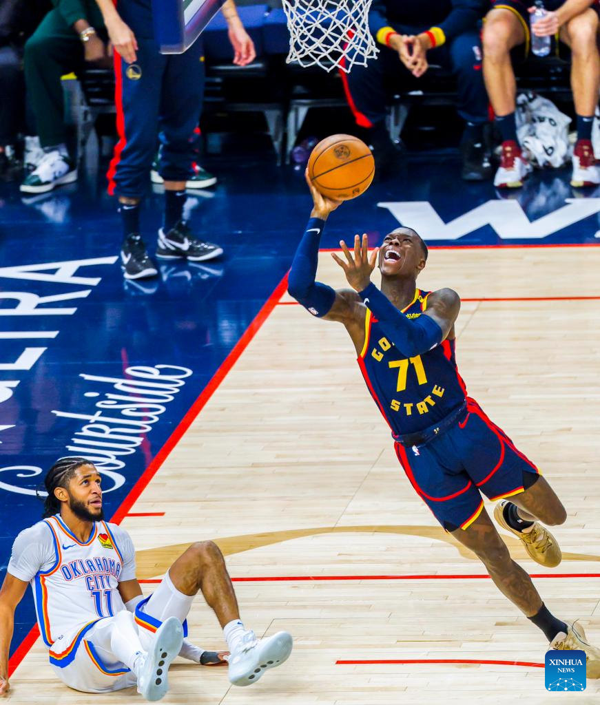 Dennis Schroder (R) of Golden State Warriors breaks through during the NBA basketball game between Golden State Warriors and Oklahoma City Thunder in San Francisco, the United States, Jan. 29, 2025 (Photo by Arthur Dong/Xinhua)