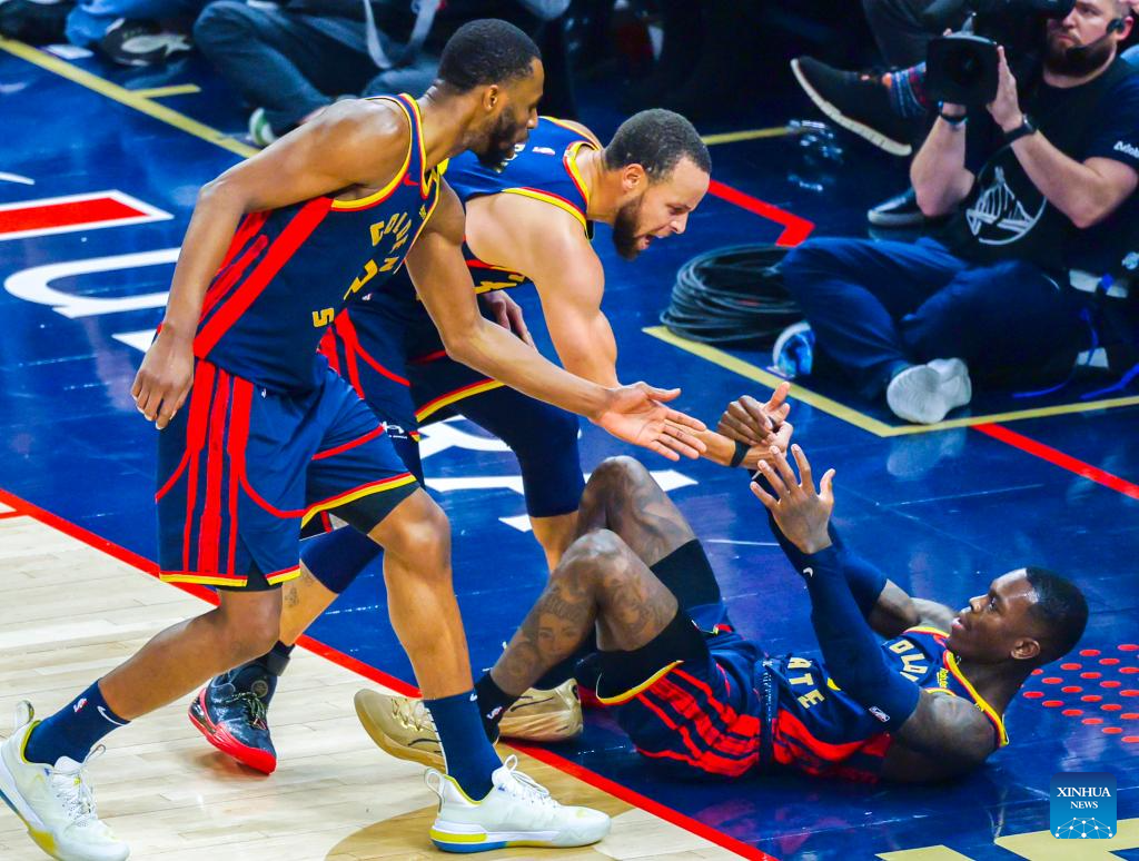 Dennis Schroder (R) of Golden State Warriors gets help from his teammates during the NBA basketball game between Golden State Warriors and Oklahoma City Thunder in San Francisco, the United States, Jan. 29, 2025 (Photo by Arthur Dong/Xinhua)