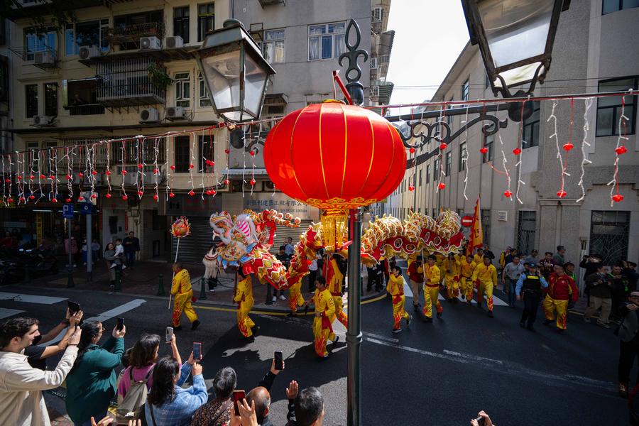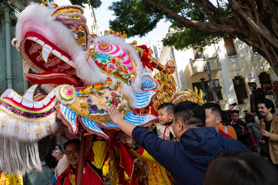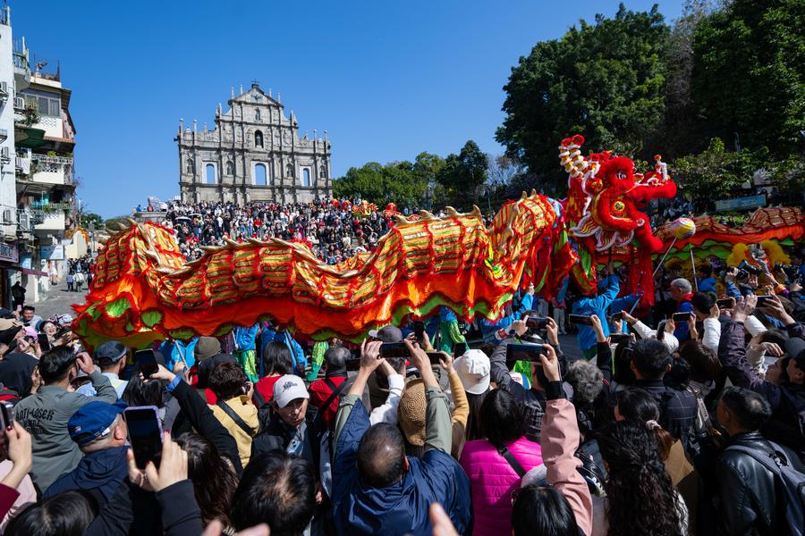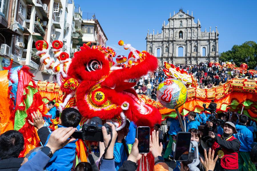 People perform dragon dance during a tour event in celebration of the Chinese New Year at the St. Lawrence Parish in Macao, south China, Jan. 29, 2025. (Xinhua/Cheong Kam Ka)People watch a dragon dance performance during a tour event in celebration of the Chinese New Year in Macao, south China, Jan. 29, 2025. (Xinhua/Cheong Kam Ka)People watch a dragon dance performance in celebration of the Chinese New Year, or the Spring Festival, near the Ruins of St. Paul's in south China's Macao, Jan. 30, 2025. (Xinhua/Cheong Kam Ka)The dragon dance performing team interact with citizens during a tour event in celebration of the Chinese New Year at the St. Lawrence Parish in Macao, south China, Jan. 29, 2025. (Xinhua/Cheong Kam Ka)People watch a dragon dance performance in celebration of the Chinese New Year, or the Spring Festival, near the Ruins of St. Paul's in south China's Macao, Jan. 30, 2025. (Xinhua/Cheong Kam Ka)■