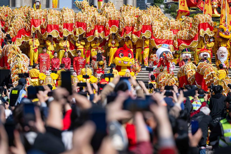 People watch a lion dance performance in celebration of the Chinese New Year, or the Spring Festival, near the Ruins of St. Paul's in south China's Macao, Jan. 30, 2025. (Xinhua/Cheong Kam Ka)