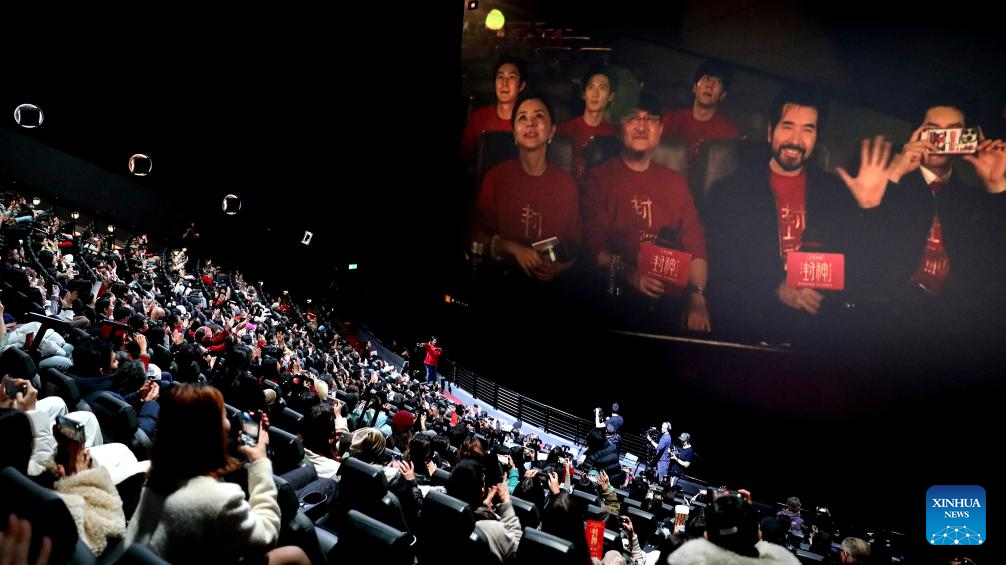 Audiences at the Britain premiere of "Creation of the Gods II: Demon Force" interact with actors of the film via video, in London, Britain, Jan. 30, 2025. (Xinhua/Li Ying)