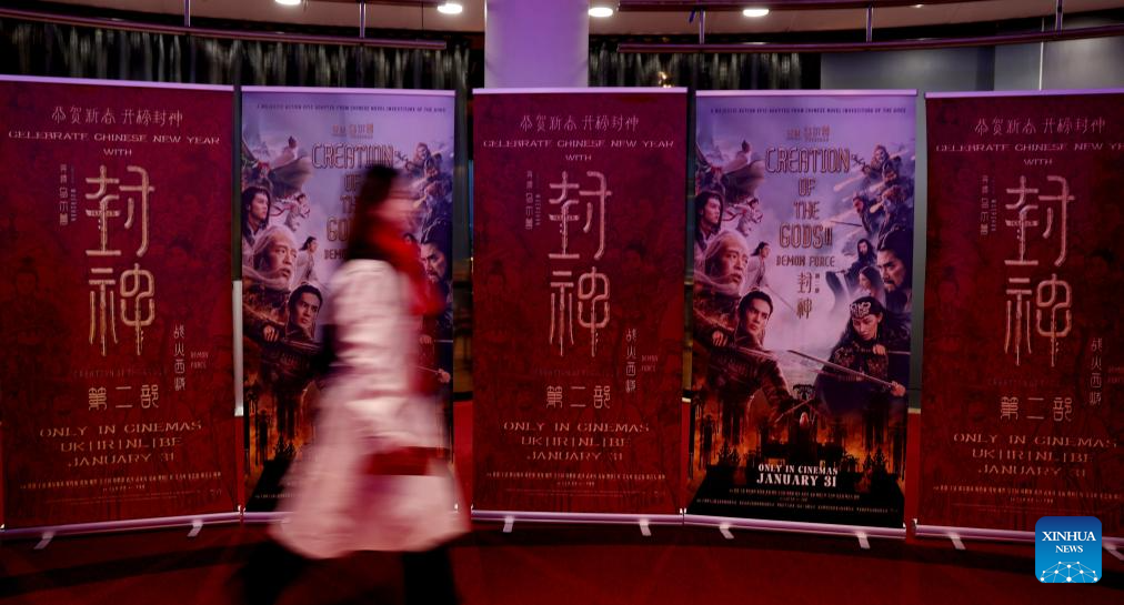 A woman walks past posters at the Britain premiere of "Creation of the Gods II: Demon Force", in London, Britain, Jan. 30, 2025. (Xinhua/Li Ying)