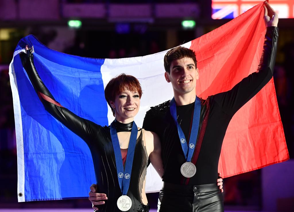 Evgeniia Lopareva (L)/Geoffrey Brissaud of France celebrate after the Ice Dance Free Dance Competition at ISU European Figure Skating Championships 2025 Tallinn in Tallinn, Estonia on Feb. 1, 2025. (Photo by Sergei Stepanov/Xinhua)