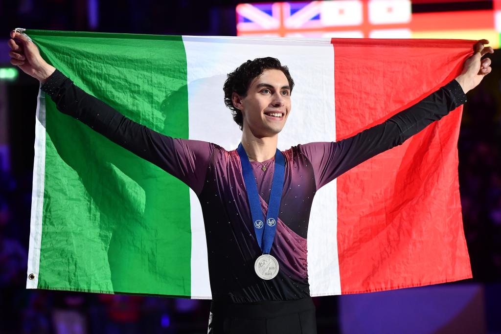 Silver medalist Nikolaj Memola of Italy celebrates after during the Men's Singles Skating Free Skating Competition at ISU European Figure Skating Championships 2025 Tallinn in Tallinn, Estonia on Feb. 1, 2025. (Photo by Sergei Stepanov/Xinhua)