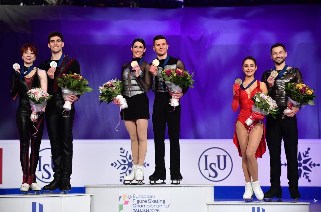 Gold medalists Charlene Guignard (3rd L)/Marco Fabbri (3rd R) of Italy, silver medalists Evgeniia Lopareva (1st L)/Geoffrey Brissaud (2nd L) of France and Lilah Fear (2nd R)/Lewis Gibson of Britain pose on the podium during the awarding ceremony after the Ice Dance Free Dance Competition at ISU European Figure Skating Championships 2025 Tallinn in Tallinn, Estonia on Feb. 1, 2025. (Photo by Sergei Stepanov/Xinhua)