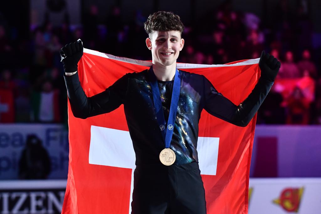 Gold medalist Lukas Britschgi of Switzerland celebrates after during the Men's Singles Skating Free Skating Competition at ISU European Figure Skating Championships 2025 Tallinn in Tallinn, Estonia on Feb. 1, 2025. (Photo by Sergei Stepanov/Xinhua)