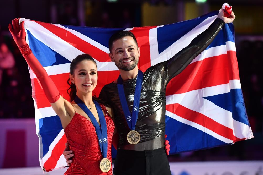 Lilah Fear (L)/Lewis Gibson of Britain celebrate after the Ice Dance Free Dance Competition at ISU European Figure Skating Championships 2025 Tallinn in Tallinn, Estonia on Feb. 1, 2025. (Photo by Sergei Stepanov/Xinhua)