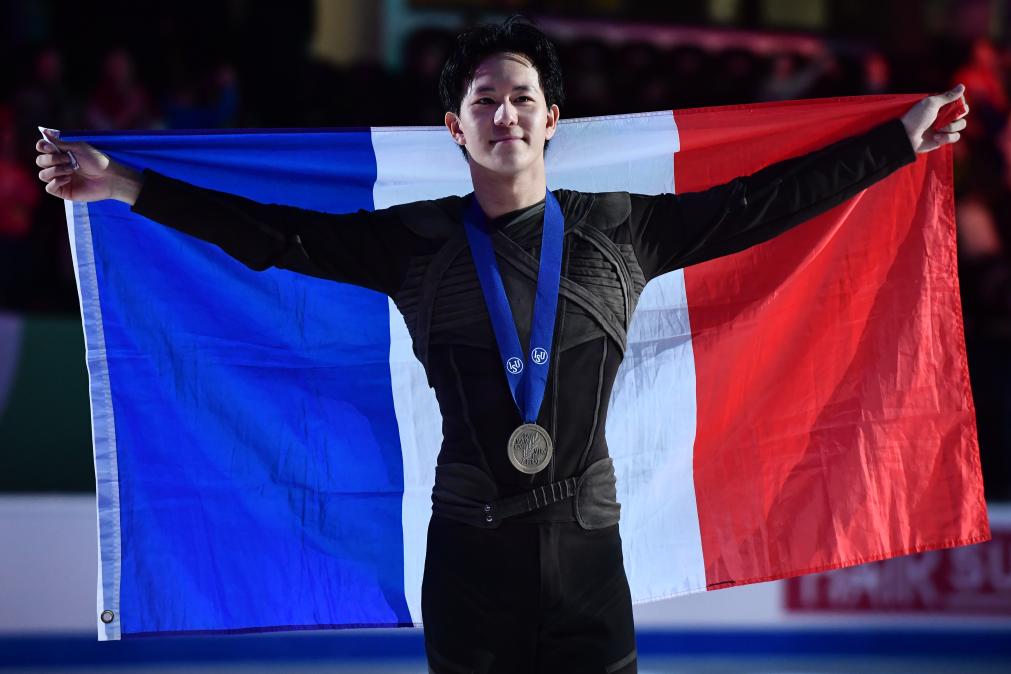 Bronze medalist Adam Siao Him Fa of France celebrates during the Men's Singles Skating Free Skating Competition at ISU European Figure Skating Championships 2025 Tallinn in Tallinn, Estonia on Feb. 1, 2025. (Photo by Sergei Stepanov/Xinhua)
