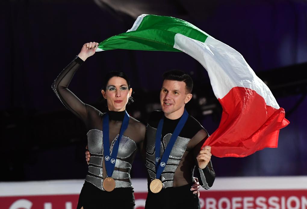Charlene Guignard (L)/Marco Fabbri of Italy celebrate after the Ice Dance Free Dance Competition at ISU European Figure Skating Championships 2025 Tallinn in Tallinn, Estonia on Feb. 1, 2025. (Photo by Sergei Stepanov/Xinhua)