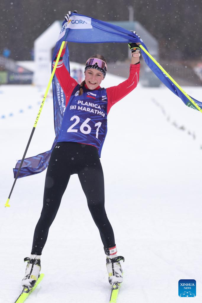 Julija Brus of Slovenia celebrates winning the women's 10km skate skiing during the International Planica Ski Marathon in Planica, Slovenia, Feb. 1, 2025. (Photo by Zeljko Stevanic/Xinhua)