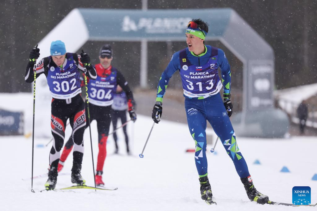 Mark Gavric (R) of Slovenia competes in the men's 21km skate skiing during the International Planica Ski Marathon in Planica, Slovenia, Feb. 1, 2025. (Photo by Zeljko Stevanic/Xinhua)