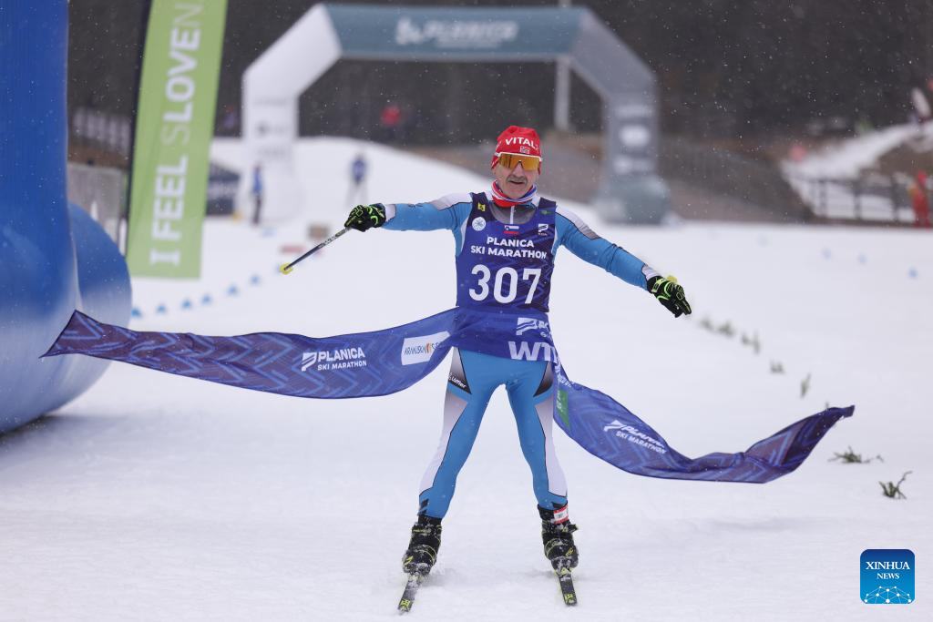 Ivan Belicka of Slovakia crosses the finish line to win the men's 10km skate skiing during the International Planica Ski Marathon in Planica, Slovenia, Feb. 1, 2025. (Photo by Zeljko Stevanic/Xinhua)