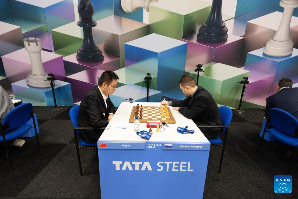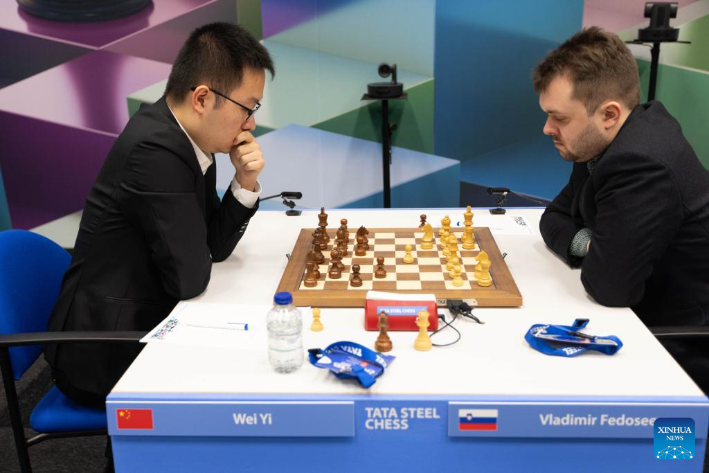 Wei Yi (L) of China competes during the last round of the Tata Steel Chess Tournament 2025 in Wijk aan Zee, the Netherlands, Feb. 2, 2025. (Photo by Sylvia Lederer/Xinhua)