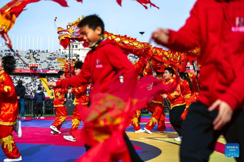 Dragon dancers perform celebrating the Chinese new year before the LaLiga football match between FC Barcelona and Deportivo Alaves, in Lluis Companys Olympic Stadium, Barcelona, Spain, on Feb. 2, 2025. (Photo by Joan Gosa/Xinhua)
