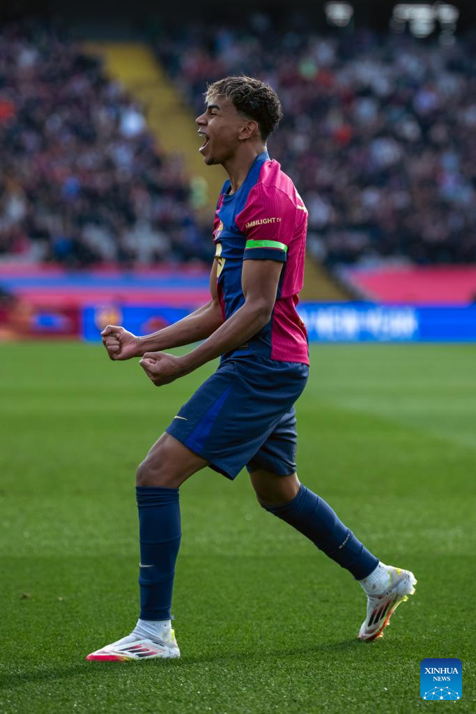 Lamine Yamal of FC Barcelona celebrates scoring during the LaLiga football match between FC Barcelona and Deportivo Alaves, in Lluis Companys Olympic Stadium, Barcelona, Spain, on Feb. 2, 2025. (Photo by Joan Gosa/Xinhua)