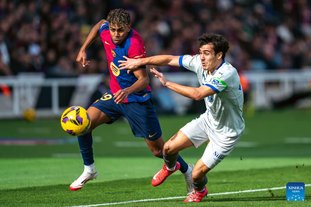 Lamine Yamal (L) of FC Barcelona vies with Manu Sanchez of Deportivo Alaves during the LaLiga football match between FC Barcelona and Deportivo Alaves, in Lluis Companys Olympic Stadium, Barcelona, Spain, on Feb. 2, 2025. (Photo by Joan Gosa/Xinhua)