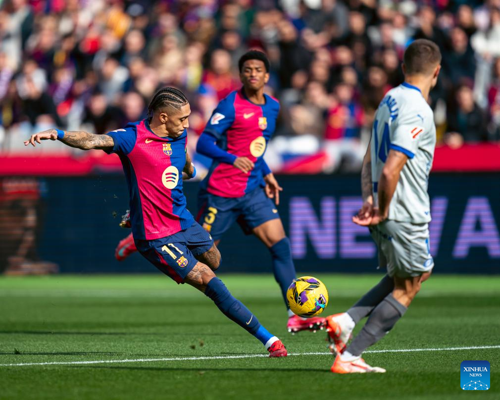 FC Barcelona's Raphinha (L) shoots during the LaLiga football match between FC Barcelona and Deportivo Alaves, in Lluis Companys Olympic Stadium, Barcelona, Spain, on Feb. 2, 2025. (Photo by Joan Gosa/Xinhua)