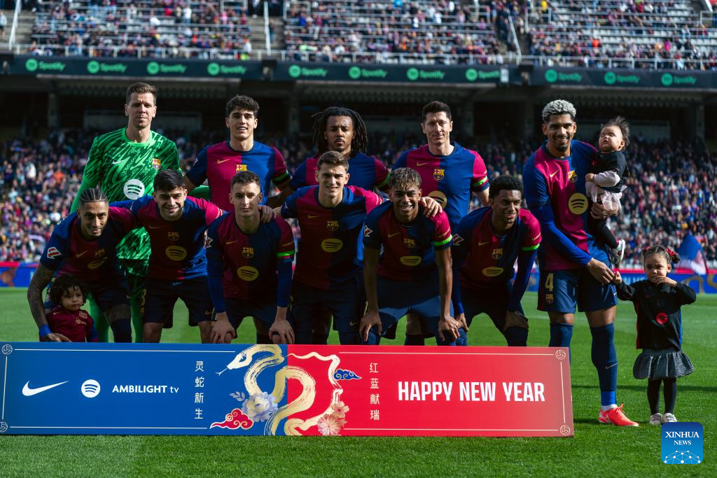 FC Barcelona's starting players celebrate the Chinese New Year before the LaLiga football match between FC Barcelona and Deportivo Alaves, in Lluis Companys Olympic Stadium, Barcelona, Spain, on Feb. 2, 2025. (Photo by Joan Gosa/Xinhua)
