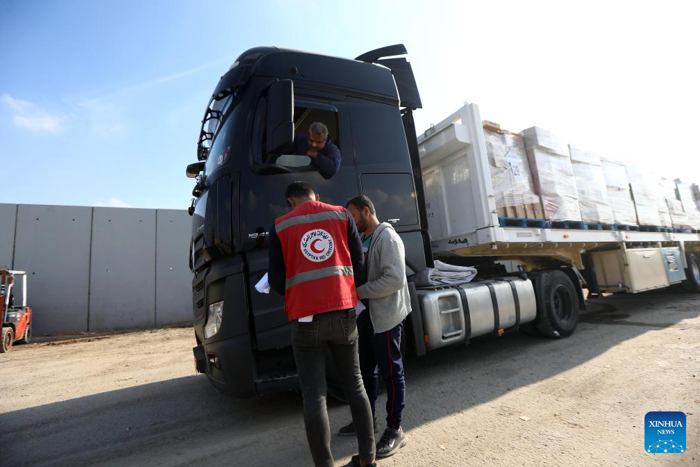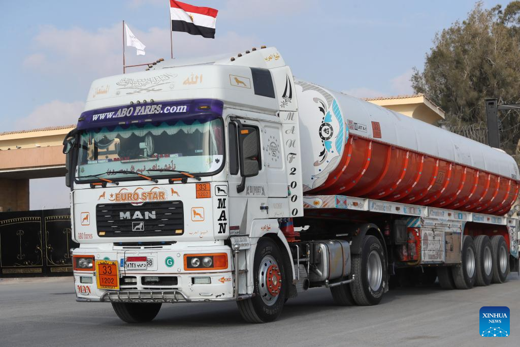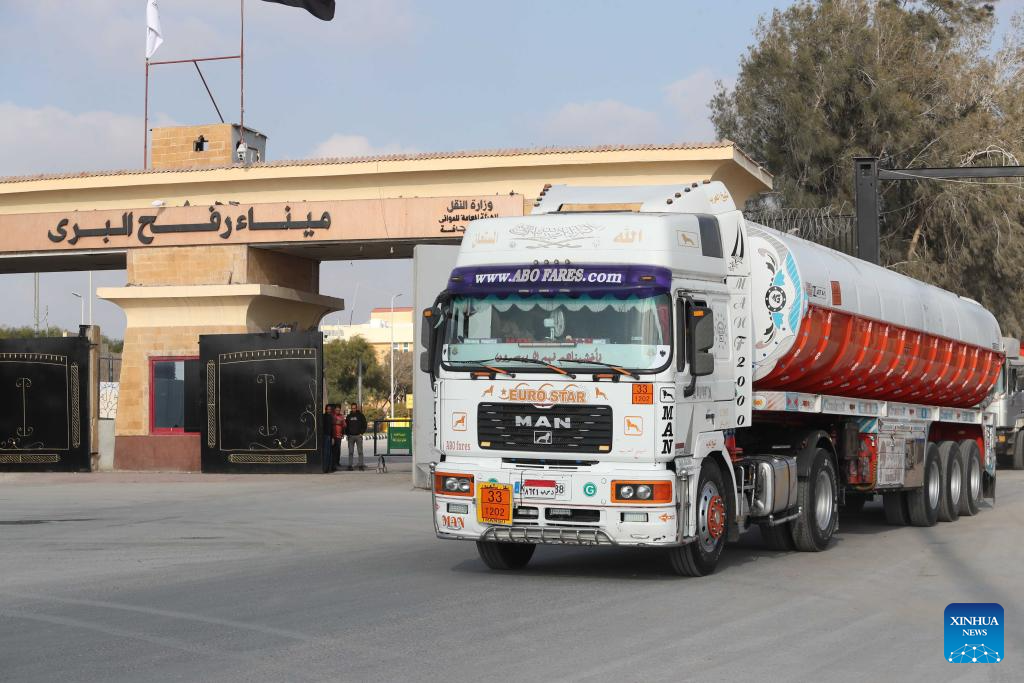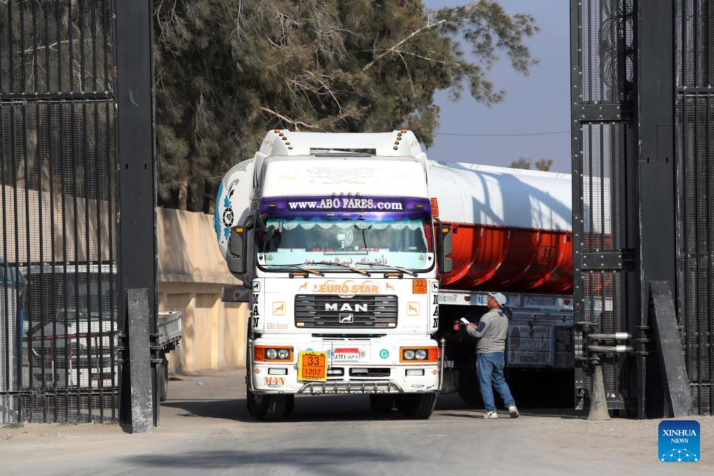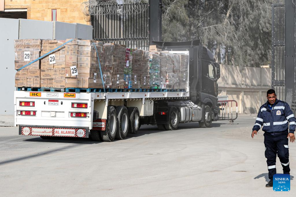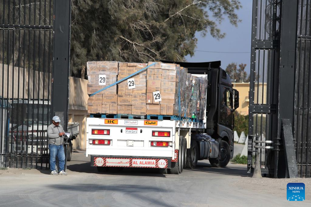 A truck with humanitarian aid enters Gaza from the Egyptian side of the Rafah border crossing, on Feb. 4, 2025. Israel and Hamas reached a three-stage ceasefire deal in January, mediated by Egypt, Qatar, and the United States, after more than 15 months of fighting in Gaza. The initial stage effective Jan. 19 lasts for six weeks and includes a limited exchange of Israeli hostages and Palestinian prisoners, increased aid into Gaza, and a partial withdrawal of Israeli troops from the enclave. (Xinhua/Ahmed Gomaa)