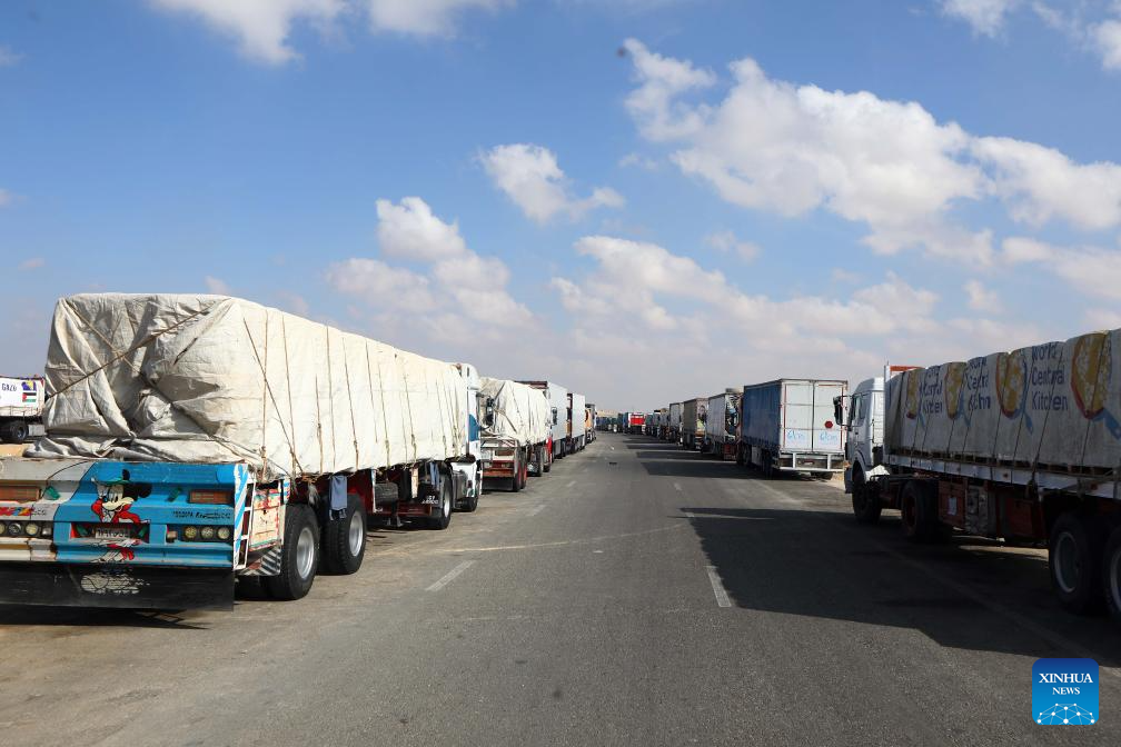 Trucks with humanitarian aid wait to enter Gaza at the Egyptian side of the Rafah border crossing, on Feb. 4, 2025. Israel and Hamas reached a three-stage ceasefire deal in January, mediated by Egypt, Qatar, and the United States, after more than 15 months of fighting in Gaza. The initial stage effective Jan. 19 lasts for six weeks and includes a limited exchange of Israeli hostages and Palestinian prisoners, increased aid into Gaza, and a partial withdrawal of Israeli troops from the enclave. (Xinhua/Ahmed Gomaa)