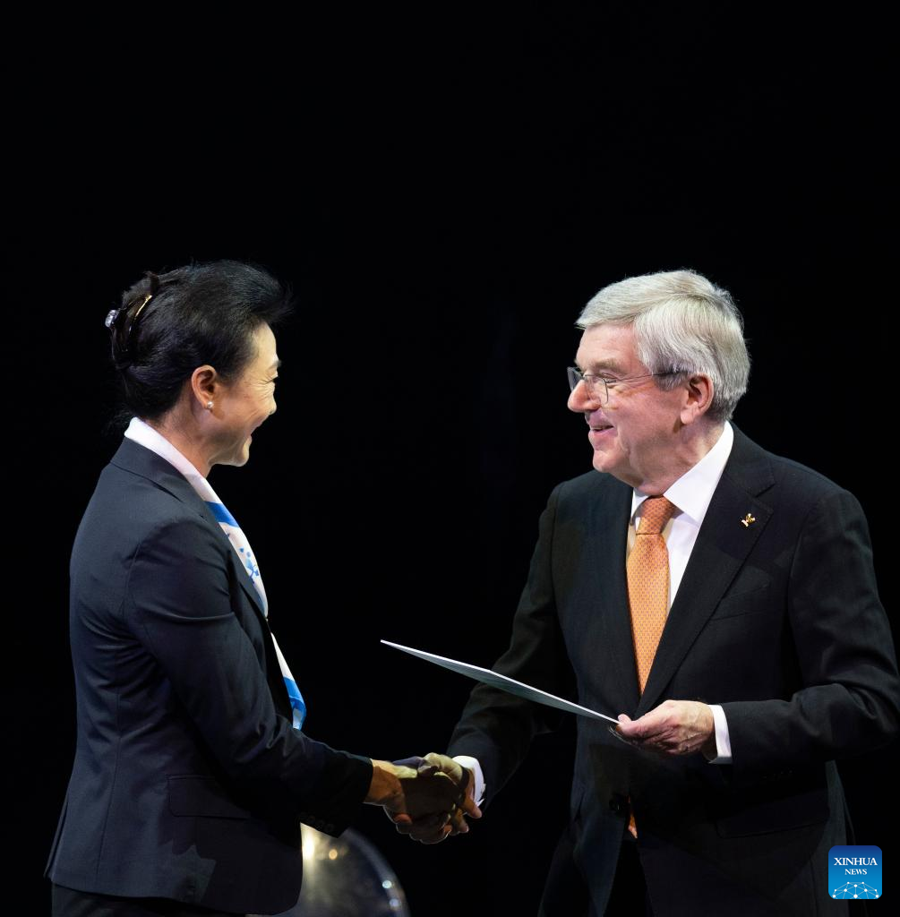 President of the International Olympic Committee (IOC) Thomas Bach (R) delivers the invitation to Li Lingwei, delegate of the Chinese National Olympic Committee a ceremony marking the one-year countdown for Milano Cortina 2026 in Milan, Italy, Feb. 6, 2025. (Xinhua/Li Jing)