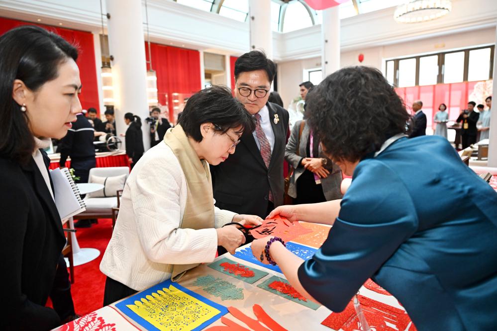 National Assembly Speaker of the Republic of Korea Woo Won-shik and his wife experience intangible cultural heritage items before a welcome banquet in Harbin, northeast China's Heilongjiang Province, Feb. 7, 2025. Chinese President Xi Jinping and his wife, Peng Liyuan, on Friday hosted a welcome banquet in China's northeastern city of Harbin for international dignitaries who are here to attend the opening ceremony of the 9th Asian Winter Games.