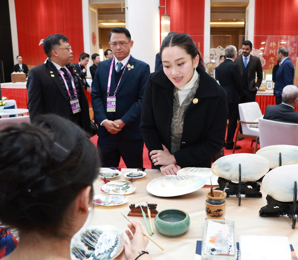 Prime Minister of Thailand Paetongtarn Shinawatra appreciates intangible cultural heritage displays before a welcome banquet in Harbin, northeast China's Heilongjiang Province, Feb. 7, 2025. Chinese President Xi Jinping and his wife, Peng Liyuan, on Friday hosted a welcome banquet in China's northeastern city of Harbin for international dignitaries who are here to attend the opening ceremony of the 9th Asian Winter Games.