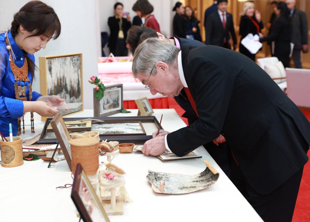 Before the banquet, the guests toured a display showcasing Heilongjiang's intangible cultural heritage. (Xinhua/Wang Ye)