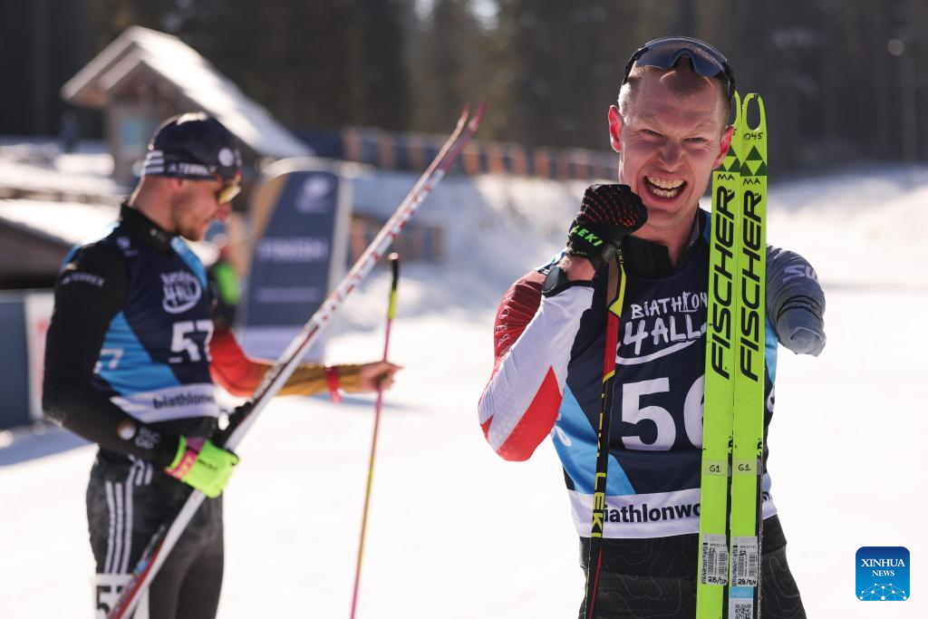 Mark Arendz (R) of Canada celebrates after winning the first place in the men's 7.5km sprint standing final during the IBU Para Biathlon World Championships in Pokljuka, Slovenia, Feb. 6, 2025. (Photo by Zeljko Stevanic/Xinhua)