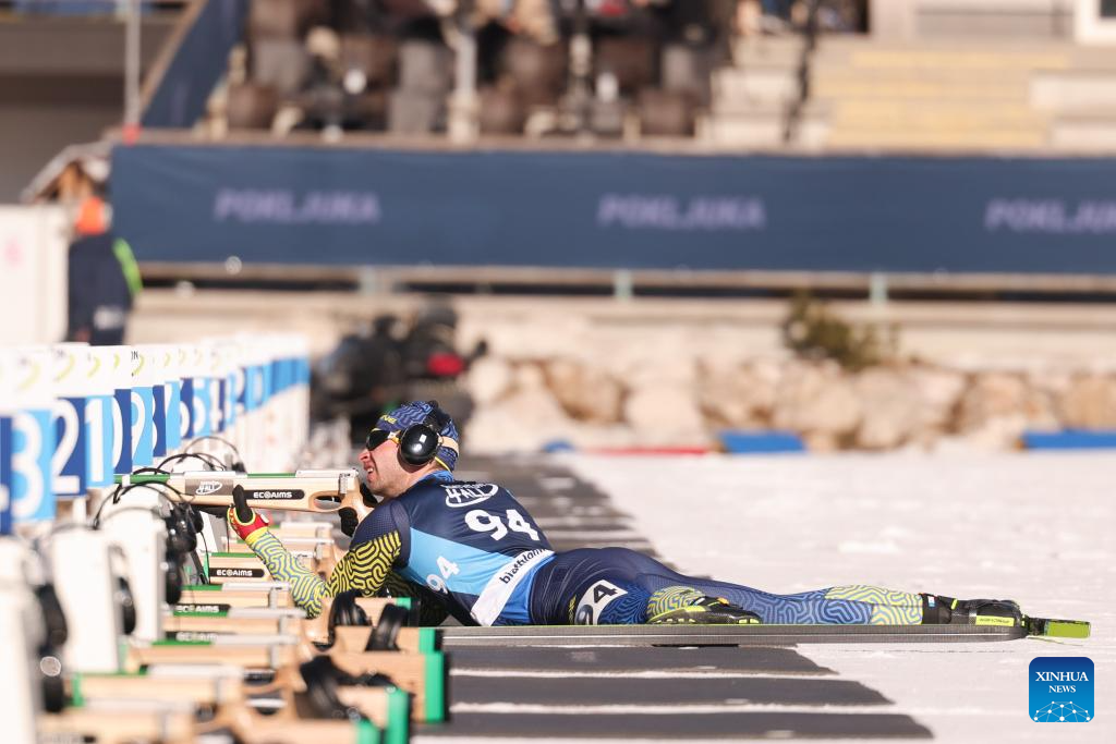 Oleksandr Kazik of Ukraine competes in the men's 7.5km sprint visual impairment final during the IBU Para Biathlon World Championships in Pokljuka, Slovenia, Feb. 6, 2025. (Photo by Zeljko Stevanic/Xinhua)