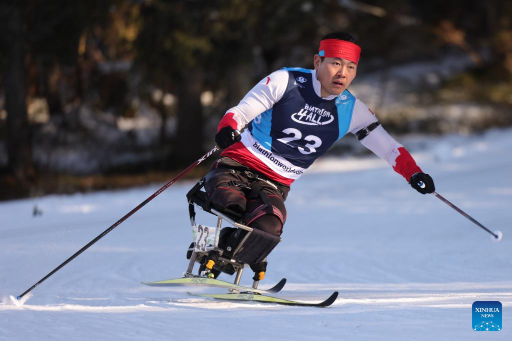 Wang Tao of China competes in the men's 7.5km sprint sitting final during the IBU Para Biathlon World Championships in Pokljuka, Slovenia, Feb. 6, 2025. (Photo by Zeljko Stevanic/Xinhua)