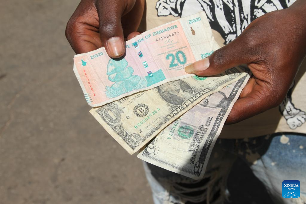 A vendor shows ZiG and U.S. dollar notes in Harare, Zimbabwe, on Feb. 7, 2025. The Zimbabwean government faces challenges in promoting the Zimbabwe Gold (ZiG) currency for financial stability, as some businesses remain reluctant to accept it, preferring the U.S. dollar, which remains legal tender under the country's multi-currency system. (Xinhua/Tafara Mugwara)