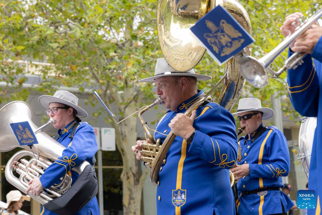A band plays during the 2025 National Multicultural Festival in Canberra, Australia, Feb. 8, 2025. The festival, running from Feb. 7 to 9 here, brings together more than 170 multicultural communities to share culture, history and heritage through food, art, songs and dances. (Photo by Chu Chen/Xinhua)