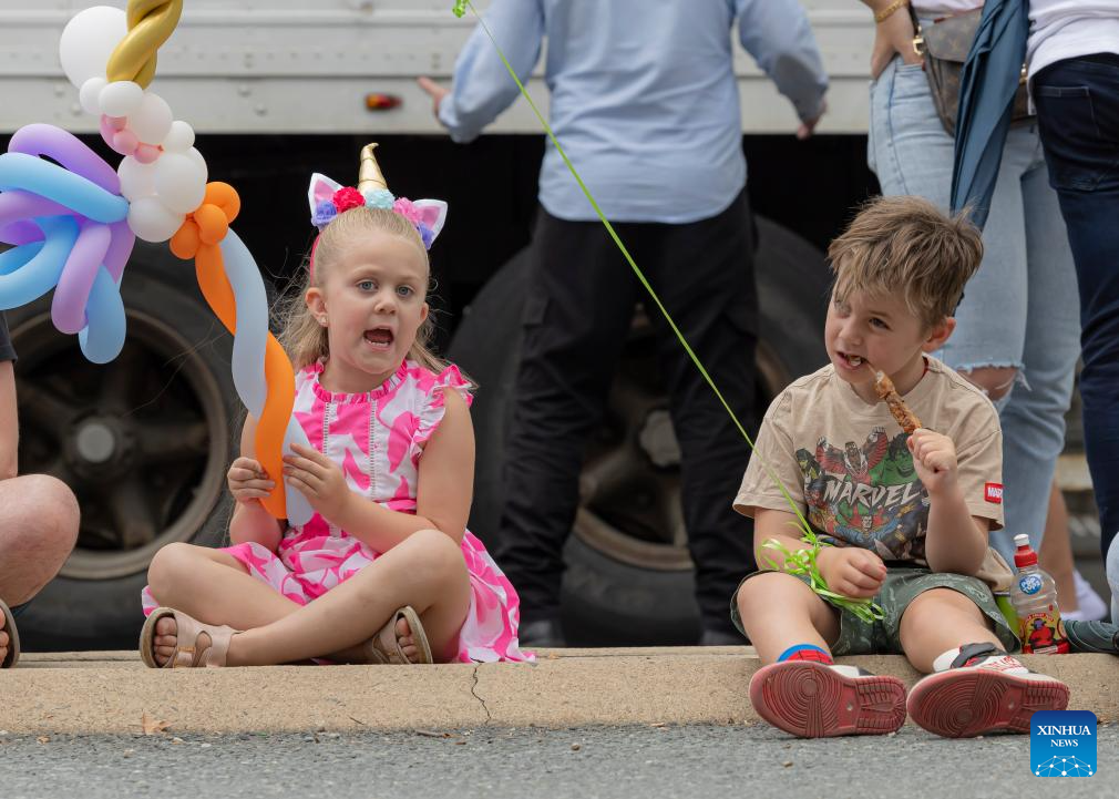 Children watch a parade during the 2025 National Multicultural Festival in Canberra, Australia, Feb. 8, 2025. The festival, running from Feb. 7 to 9 here, brings together more than 170 multicultural communities to share culture, history and heritage through food, art, songs and dances. (Photo by Chu Chen/Xinhua)