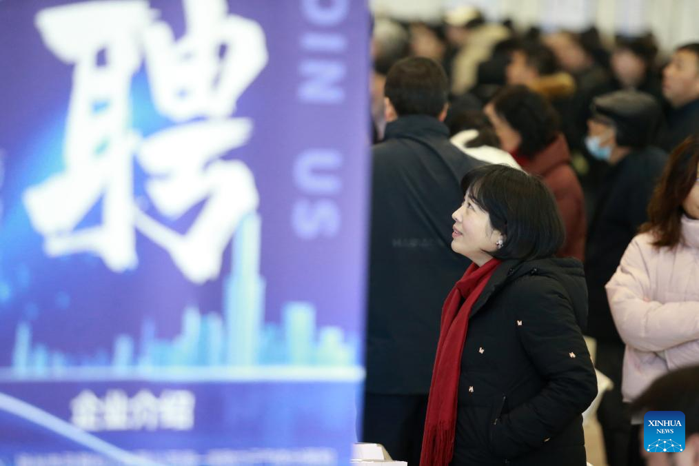 A job seeker checks job information during a job fair in Yangzhou, east China's Jiangsu Province, Feb. 8, 2025. (Photo by Meng Delong/Xinhua)