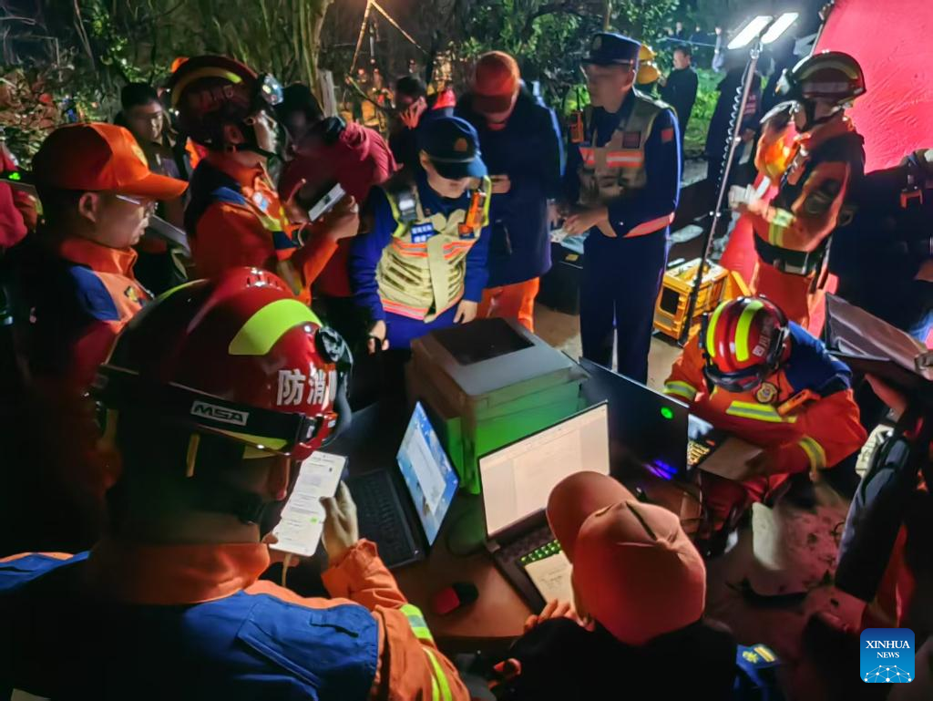 Staff members work at an emergency command center in Jinping Village, Junlian County in the city of Yibin, southwest China's Sichuan Province, Feb. 8, 2025.
