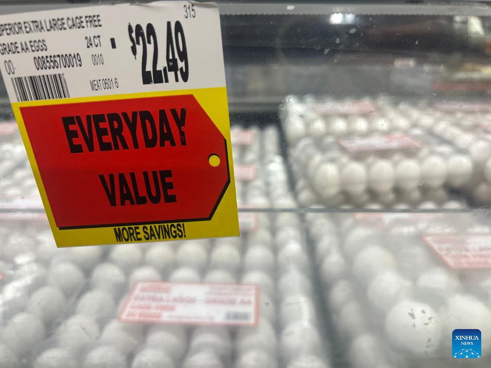 This photo taken with a mobile phone on Feb. 7, 2025 shows a price tag on a shelf for eggs at a local supermarket in El Monte, Los Angeles County, California, the United States. (Photo by Zeng Hui/Xinhua)