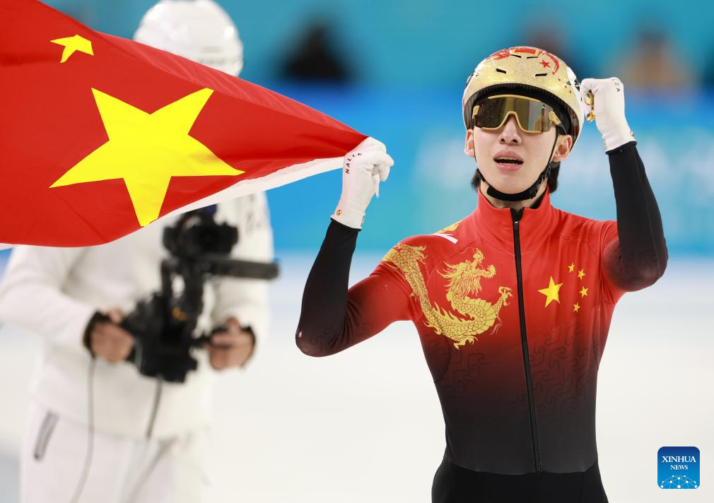 Lin Xiaojun of China celebrates after the men's 500m final match of the short track speed skating event at the 9th Asian Winter Games in Harbin, northeast China's Heilongjiang Province, Feb. 8, 2025. (Xinhua/Xu Yanan)