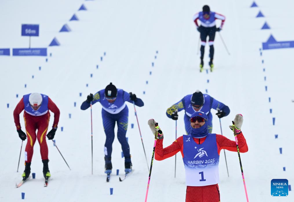 Wang Qiang of China (front) reacts during the men's sprint classic final match of the cross-country skiing event at the 9th Asian Winter Games in Yabuli, northeast China's Heilongjiang Province, Feb. 8, 2025. (Xinhua/Zhang Long)