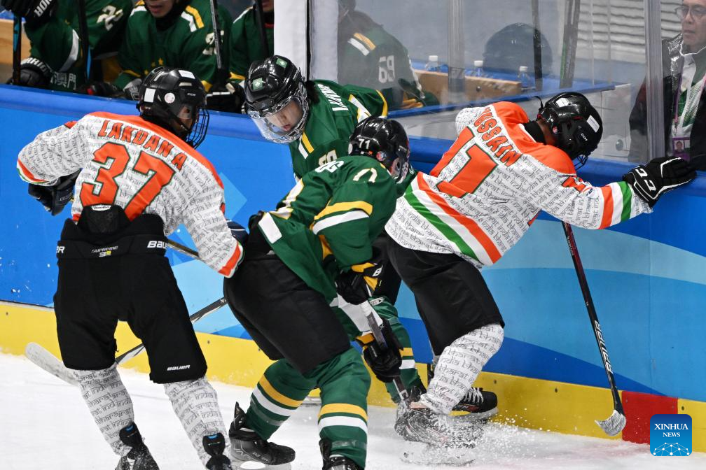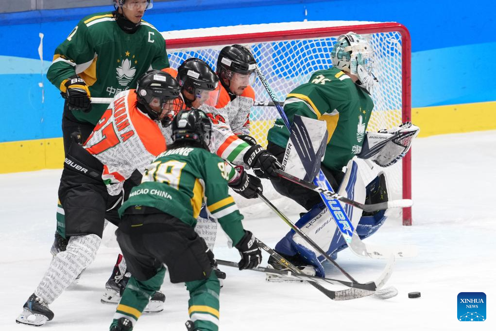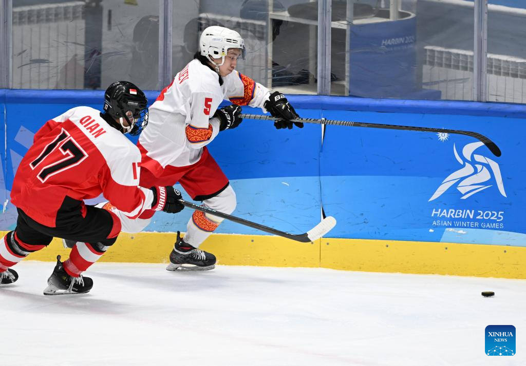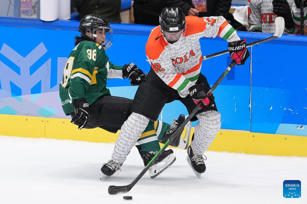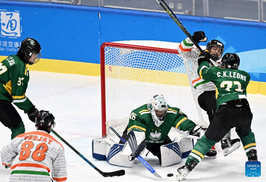 Players of both sides compete during the men's ice hockey group C match between India and China's Macao at 2025 Asian Winter Games in Harbin, northeast China's Heilongjiang Province, on Feb. 9, 2025. (Xinhua/Li Ziheng)